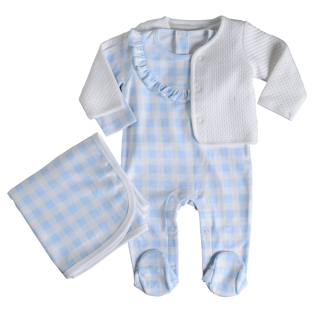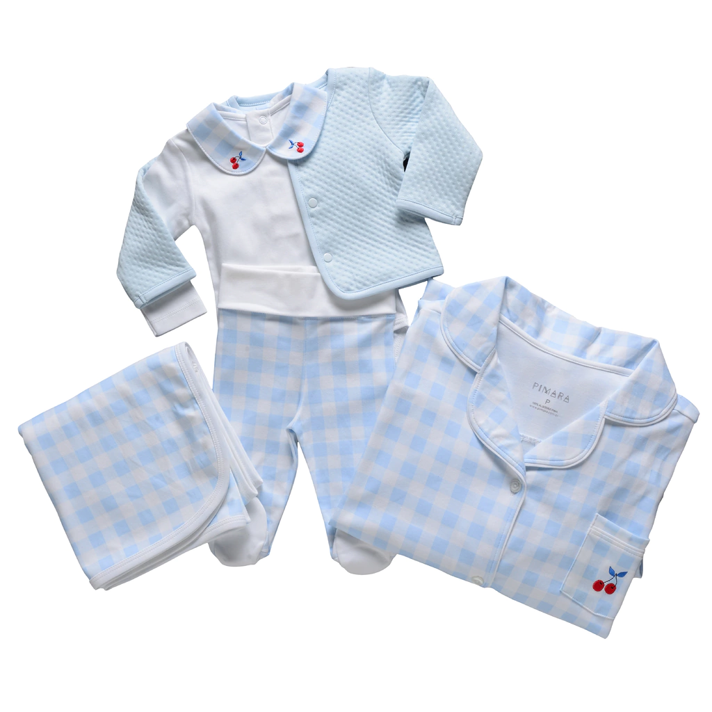 A Coleção "Vichy Celeste" traz o romantismo para nossa linha. E adoramos sugerir que seja usado com estampas coloridas para quem busca vestir seu bebê de maneira moderna e descolada. Temos muitas opções para os bebê nesta estampa, como: body kimono, calça punho, macacão, salopete, macacão bebê manga longa, os pijamas para kids e para as mães também. Atendemos aos pedidos para ter a linha Mãe e Filhos. Veja o pijama infantil em Pijamas Kids e o de adulto no site da PIMARA.